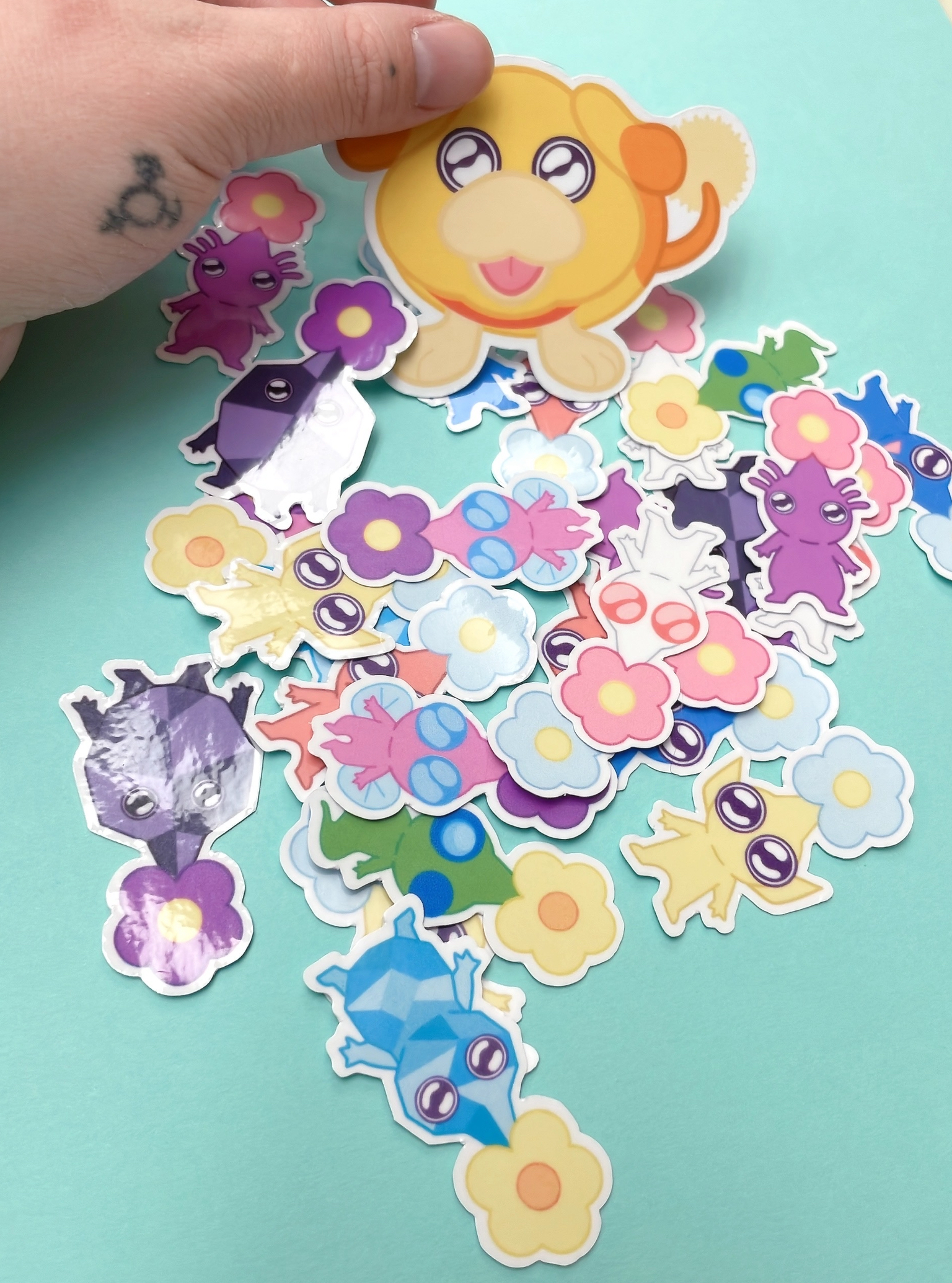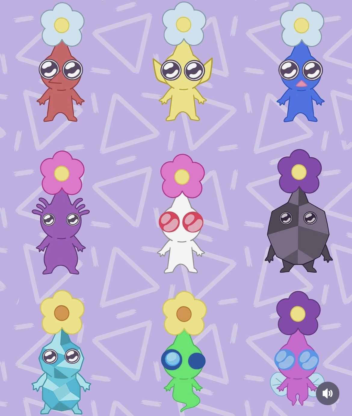 A pack of 2 inch stickers of each pikmin type plus a 3 inch Oatchi sticker. Stickers are waterproof vinyl.